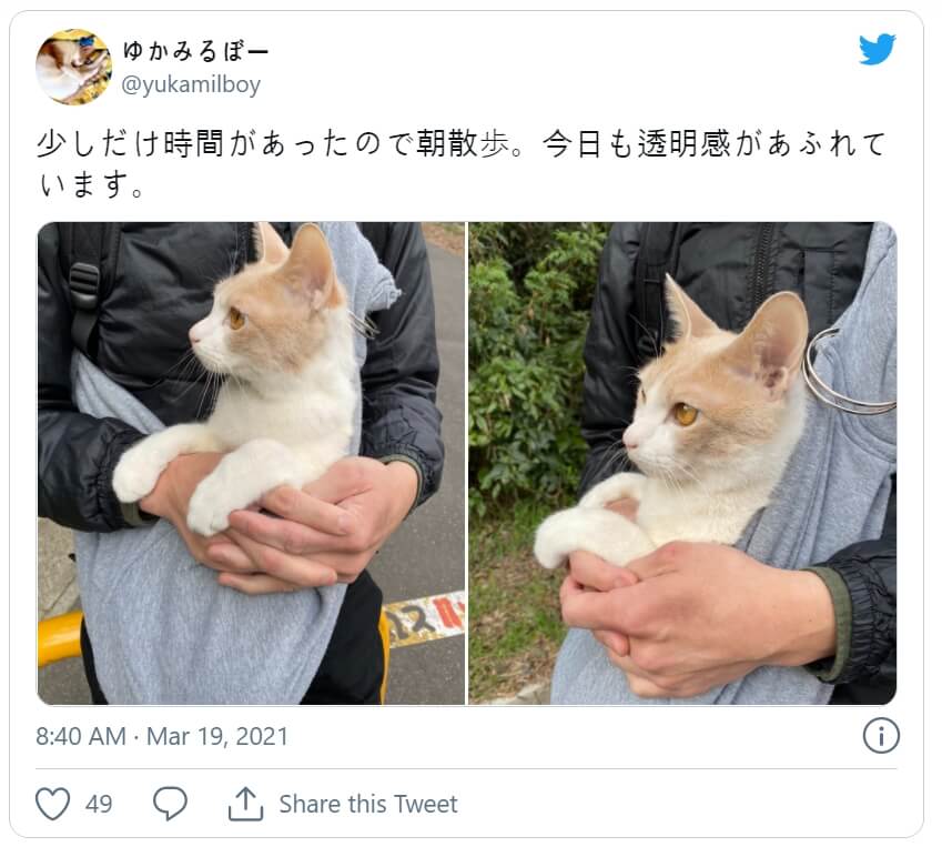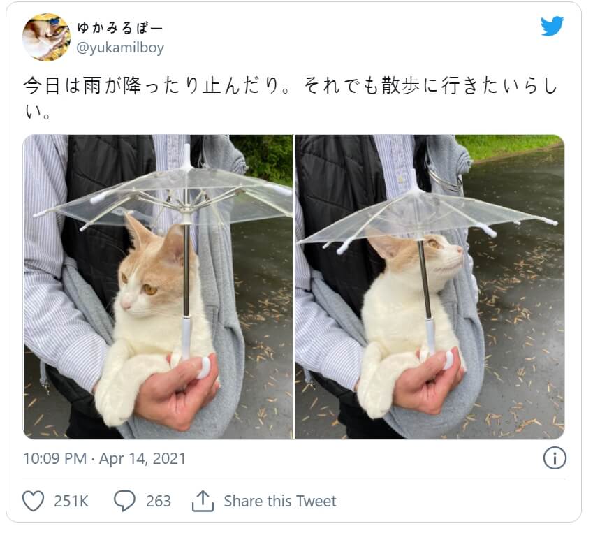 비오는 날은 대부분의 고양이 친구들에게는 실내에서 몸을 웅크리고 있는 핑계이지만, 일본의 한 고양이에게는 자신의 우산을 사용할 수 있는 기회를 갖는다. 미루찬은 밖에 나가는 것을 좋아하지만, 자유롭게 다니는 대부분의 고양이들과는 달리, 그는 그의 사람에 의해 이동하는 것을 선호한다. 꼬투리가 달린 고양이는 아기 캥거루처럼 천 주머니 안에 편안하게 앉아 있다. 그리고 비가 올 때, 그는 개인 우산으로 보호받는다.